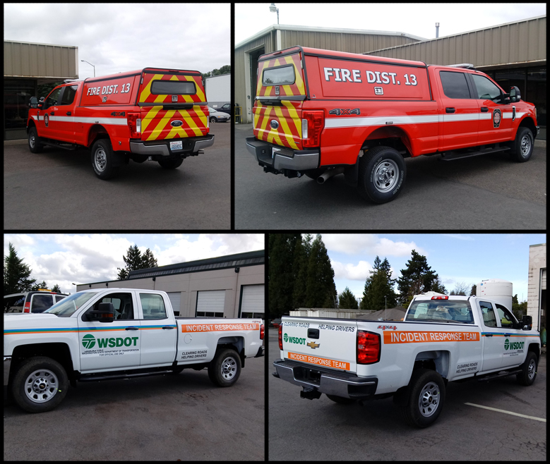 Fire apparatus and emergency vehicles, enclosed trailers, utility vans and box trucks, municipal and work fleets, vinyl decals, and lettering: we do the graphics work you need. Full vehicle wraps are not a service we offer. See vehicle graphics examples.